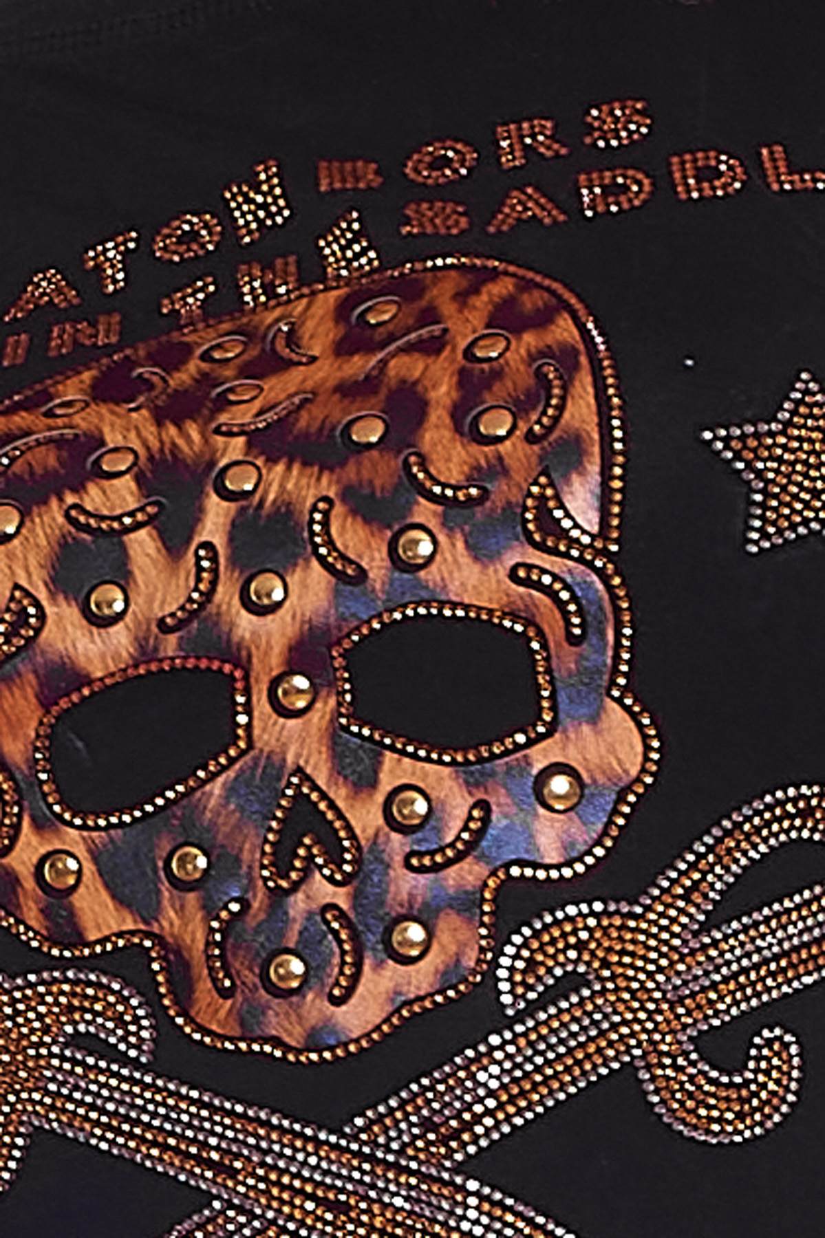 Una blusa elástica que tiene manga corta y un estampado en la parte en la parte frontal formado con una textura distinta, con tachuelas y con strass.
